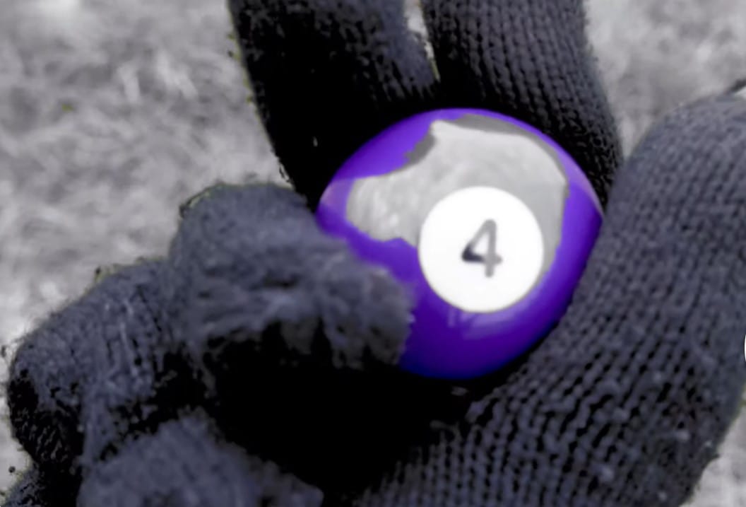 In this one, a masked character (*cough* Noir *cough*) pulls the blue billiard ball out of his pocket (I'm resisting the urge to make a joke about Pocket Pool here...) while sitting in the bathtub. Then, he proceeds to get into an actual automobile, drive himself a good distance away, walk into the middle of a large, empty field, and throw the ball on the ground before leaving.